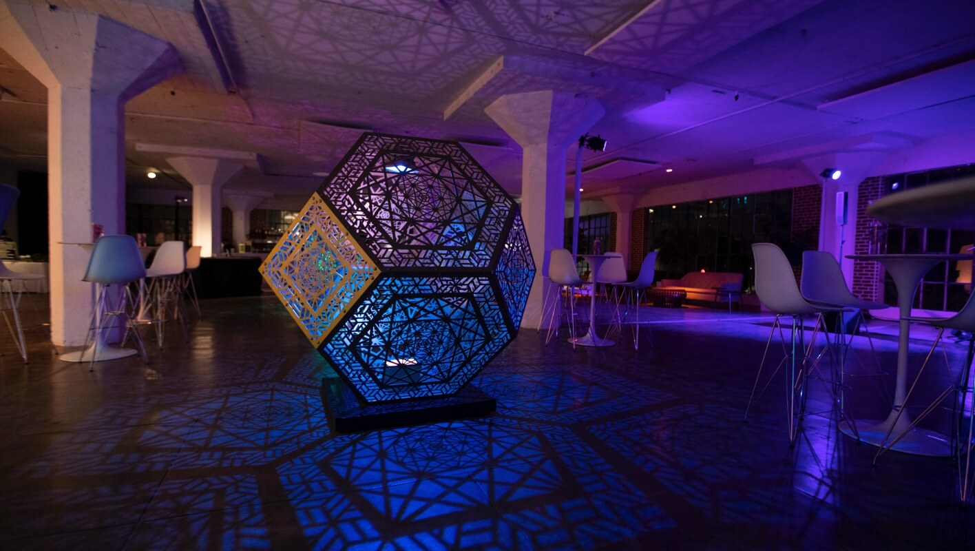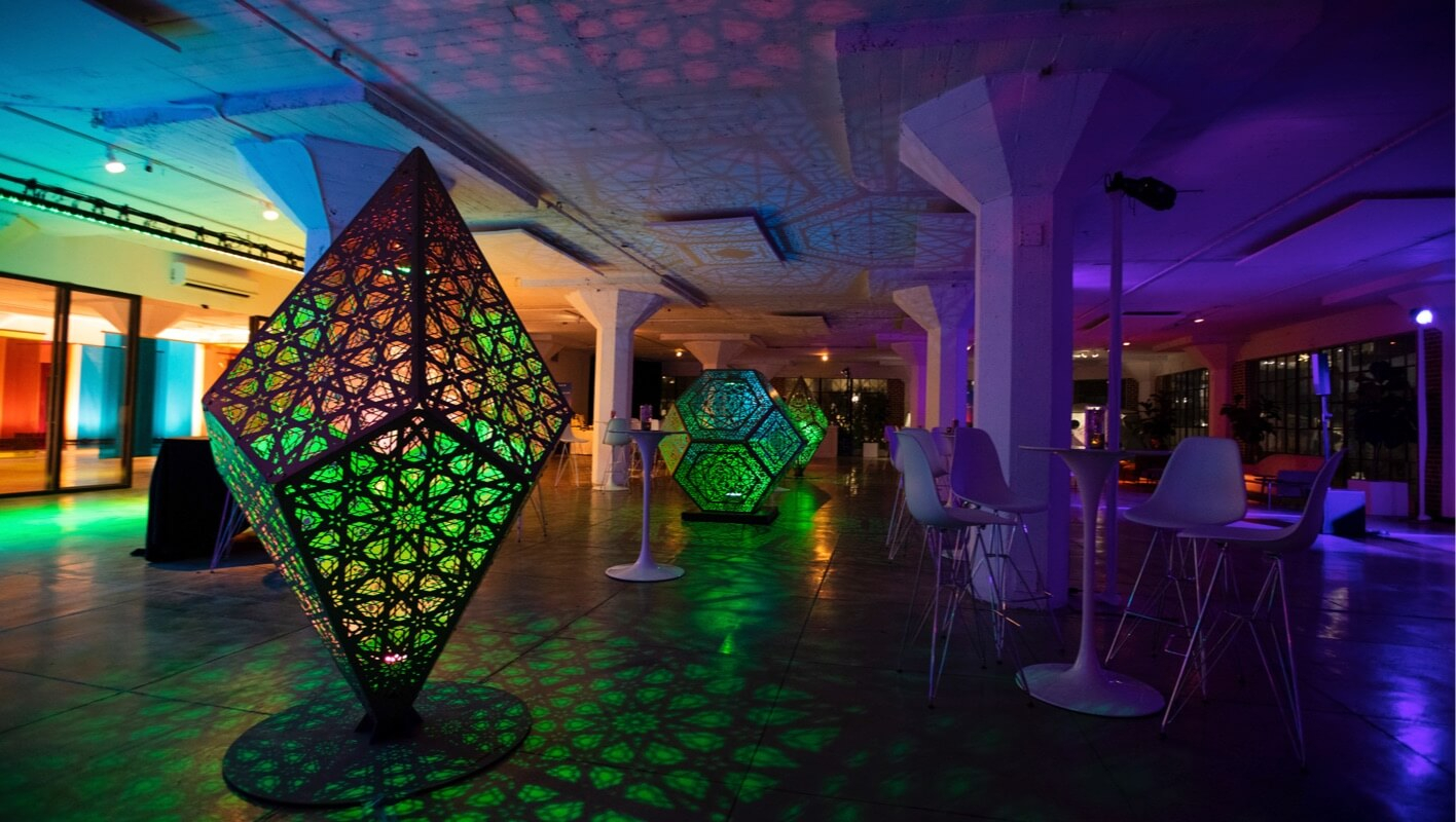 Three massive artist installations, called HYBOCOZOs, anchored the space and emitted multi-colored projected shadows throughout the venue. Two different custom portrait experiences let attendees promote their personal brand: A custom Vanity Fair-like photo studio produced light and dark hued duotone photo ops.