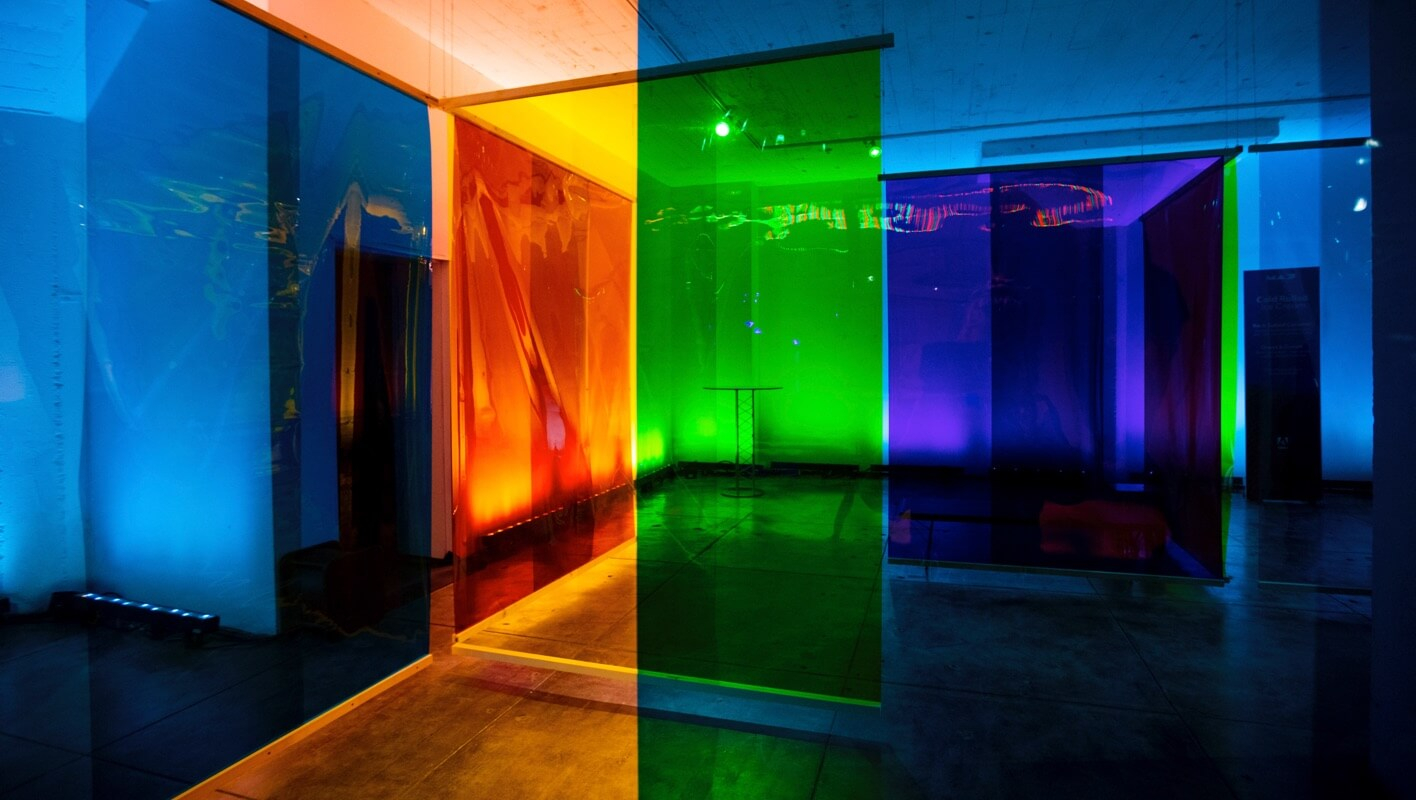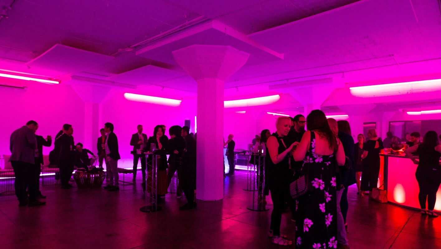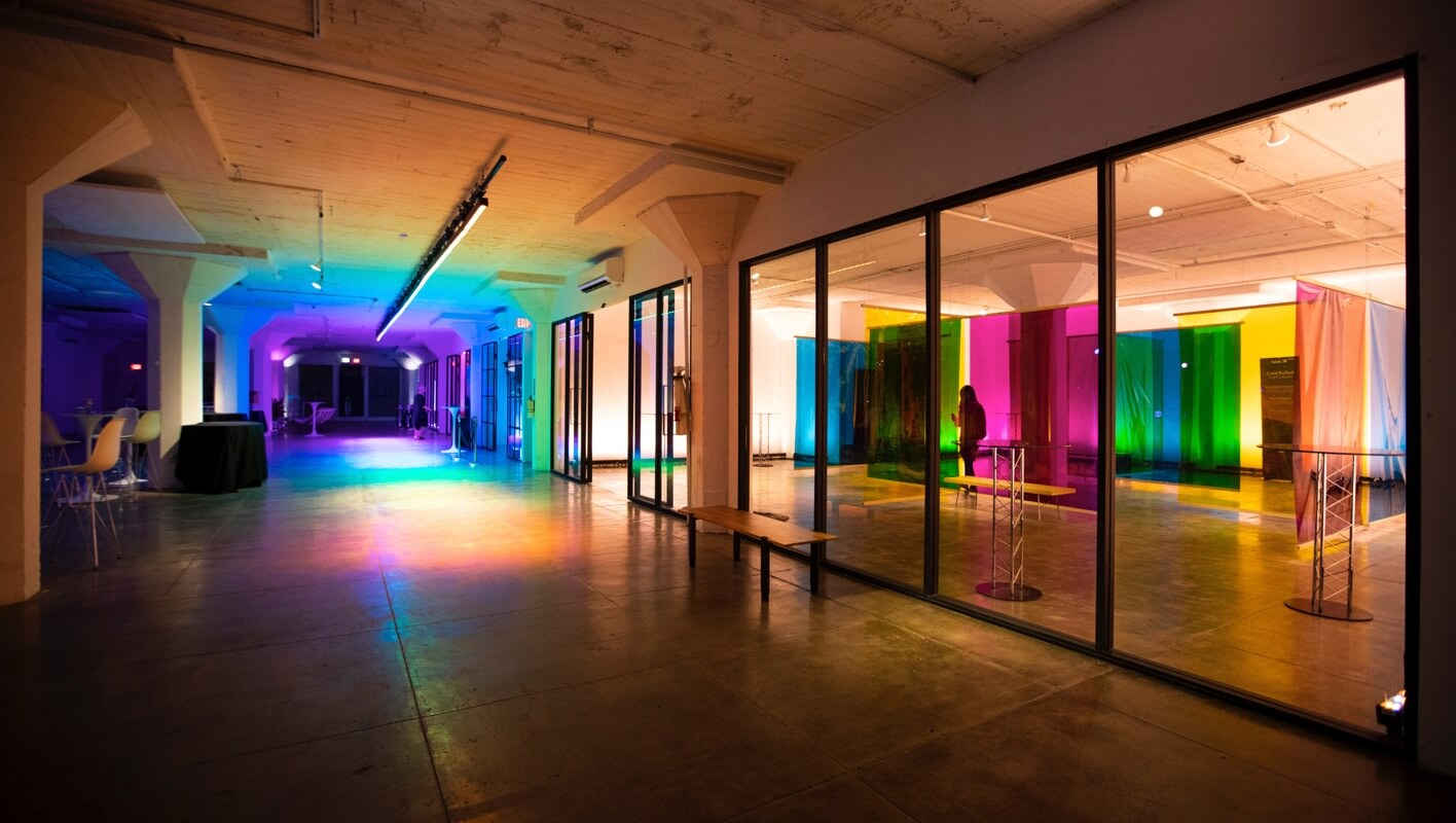 The full prism of color was integrated throughout the space. An Ombré styled, neon-lit freight elevator brought guests to the main loft space where they were greeted by floor-to-ceiling cellophane walls.